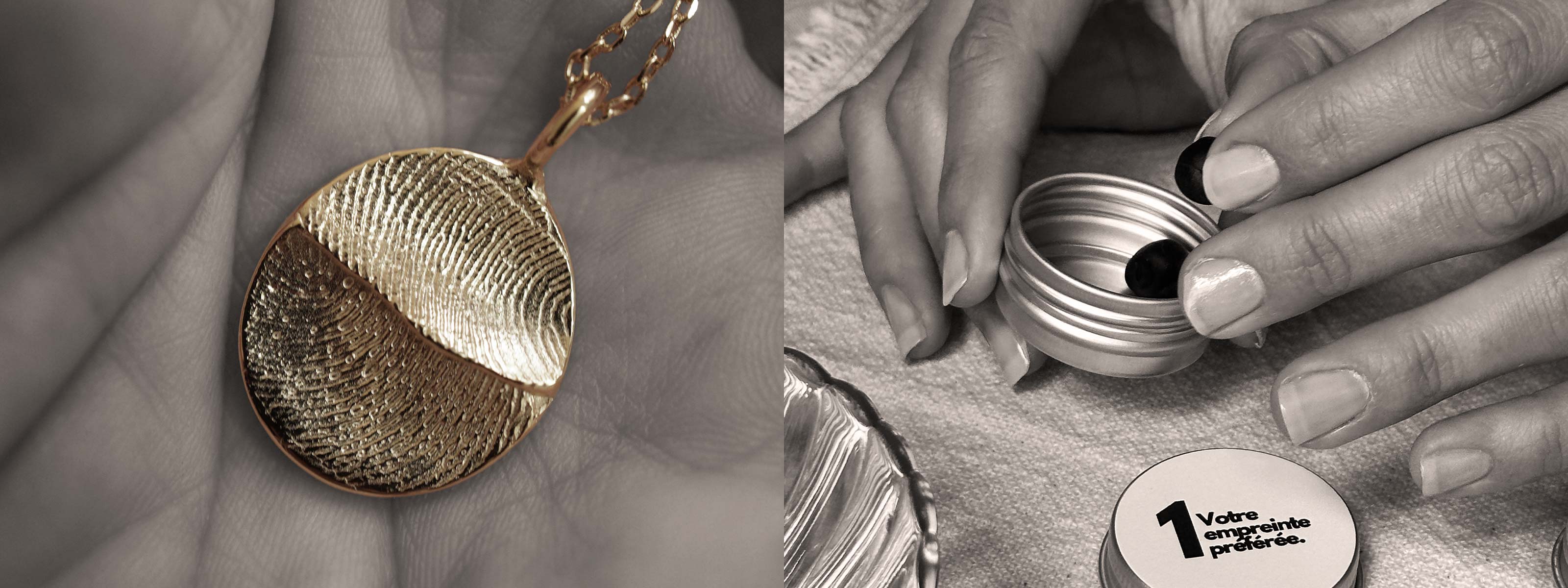 À partir d’une véritable empreinte digitale ou animale, chaque bijou est façonné à la main dans mon atelier.